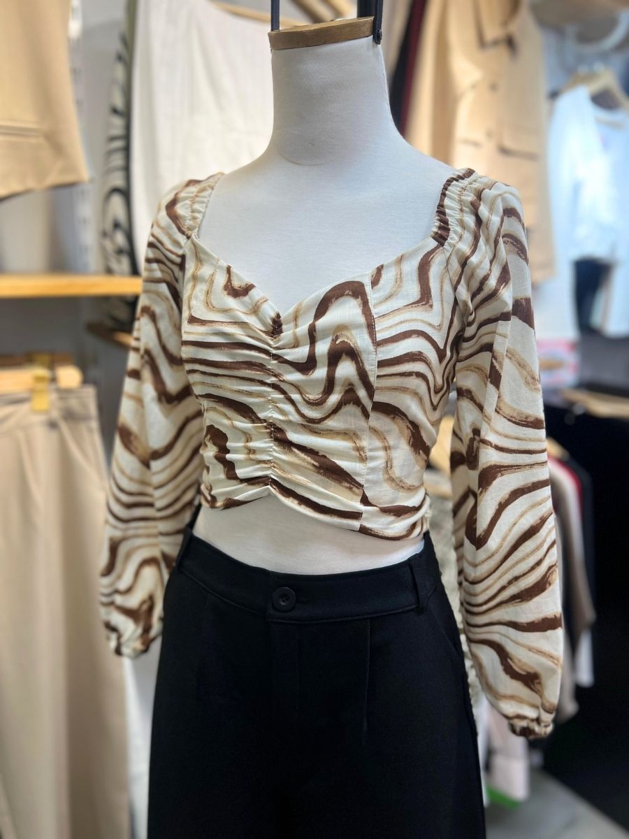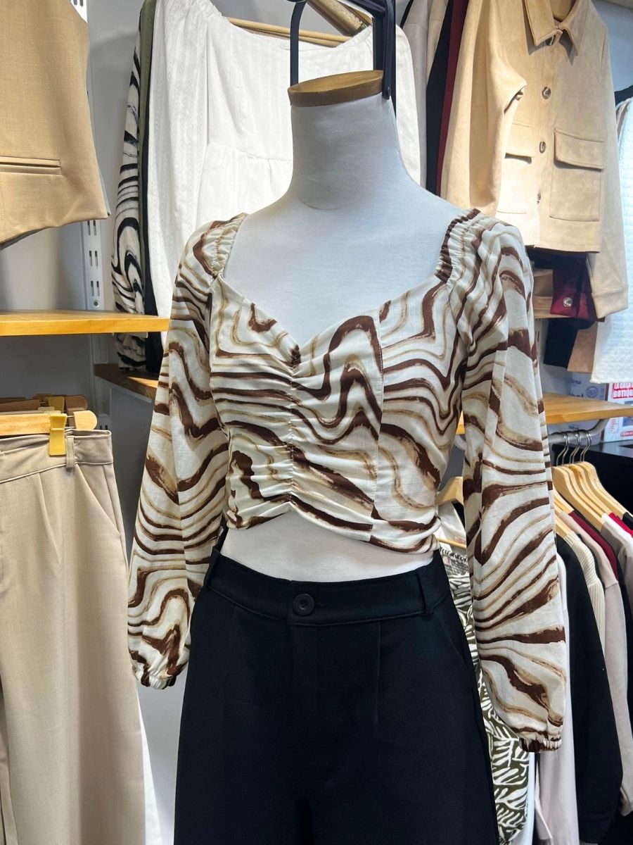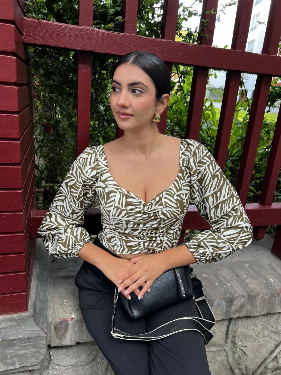 Blusa de manga larga con escote corazón y puños elasticados. Fruncido en parte delantera para acentuar el escote y elastico de mil agujas en la espalda para mejor ajuste. Hecho en tela Amaya. Producción 100% peruana.