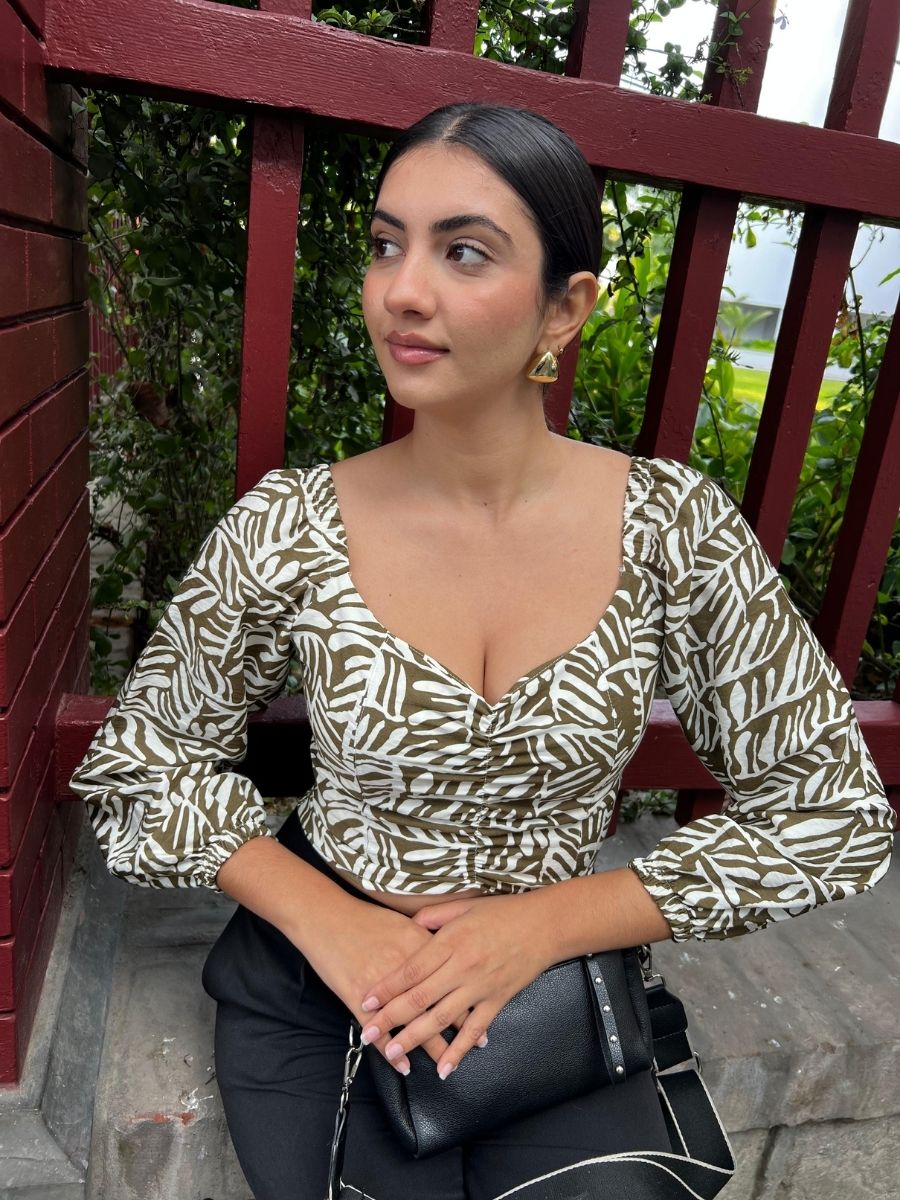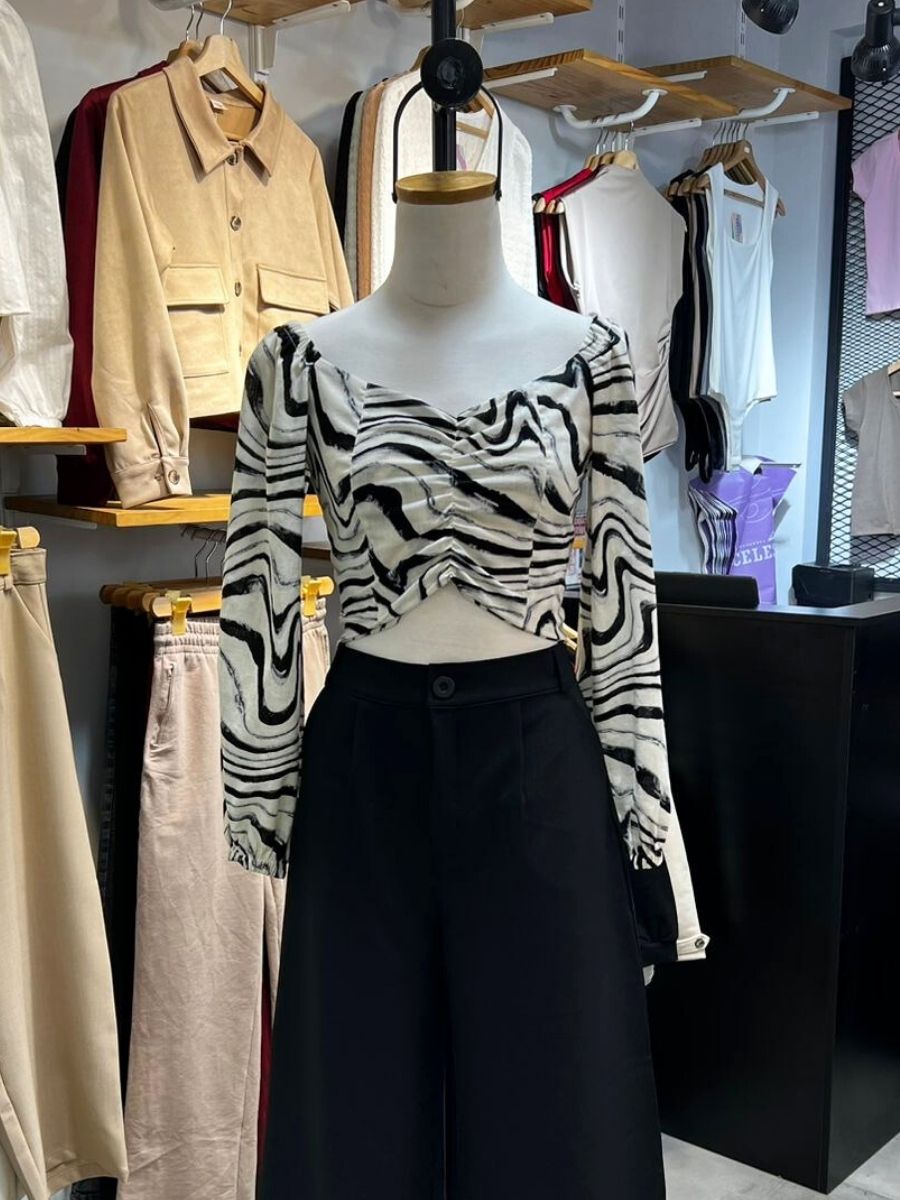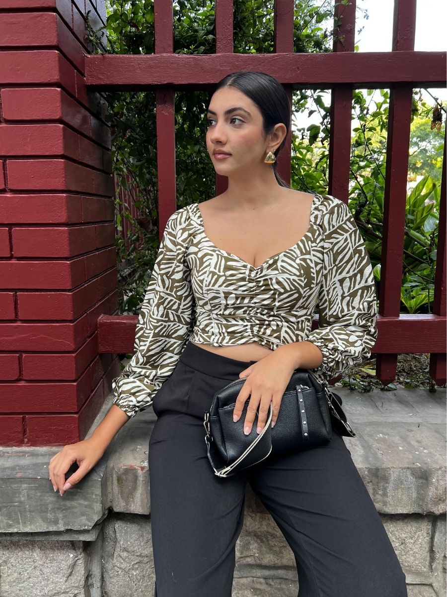 Blusa de manga larga con escote corazón y puños elasticados. Fruncido en parte delantera para acentuar el escote y elastico de mil agujas en la espalda para mejor ajuste. Hecho en tela Amaya. Producción 100% peruana.