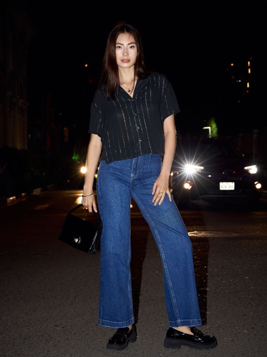 Blusa corte cuadrado, cuello camisero, con botones delanteros. Hecha en lino lurex, con brillos que le dan un toque. Producción 100% peruana.