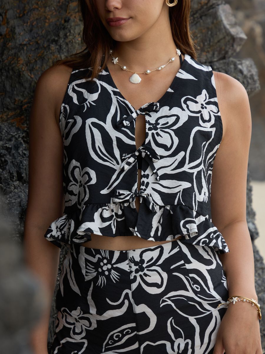 Blusa corta de escote en v y ajustable con tirantes frontales. Úsala sola o con nuestro short Valentina para un total look. Hecha en Bali estampado. Producción 100% peruana.
