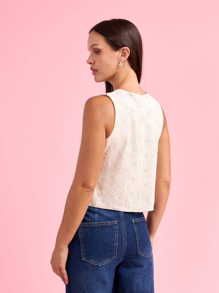 Chaleco clásico con botones delanteros. Hecho en broderie. Producción 100% peruana.