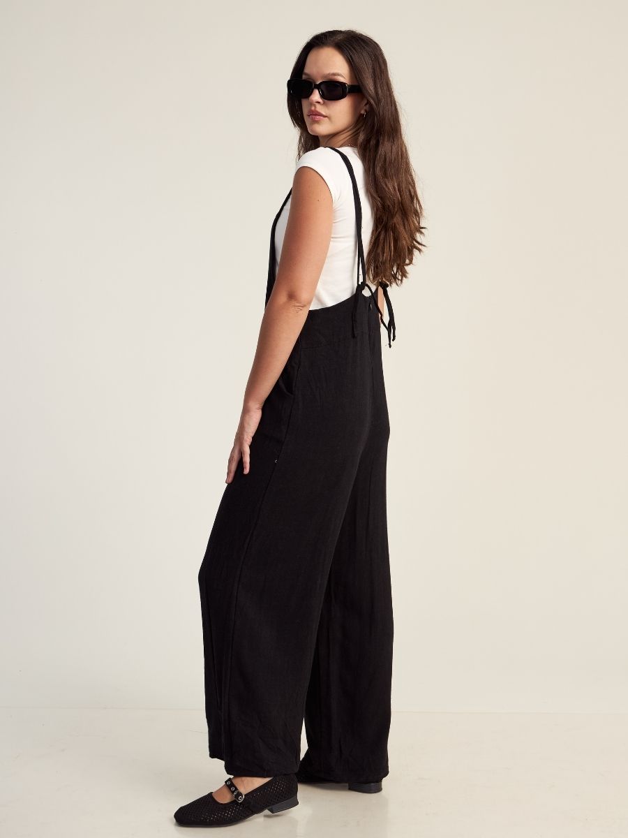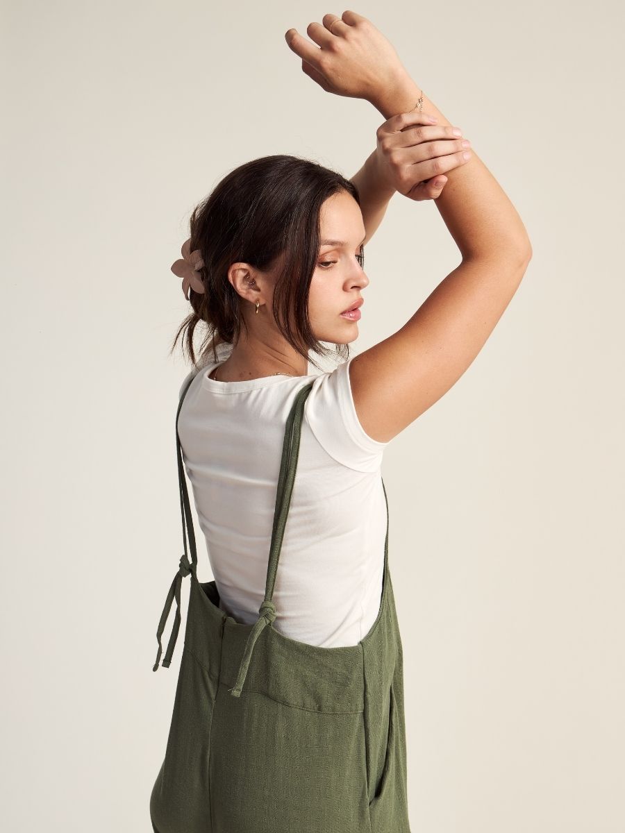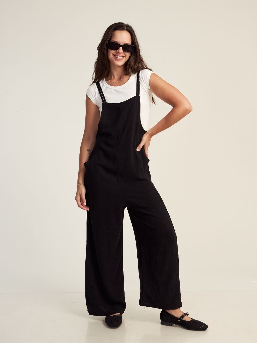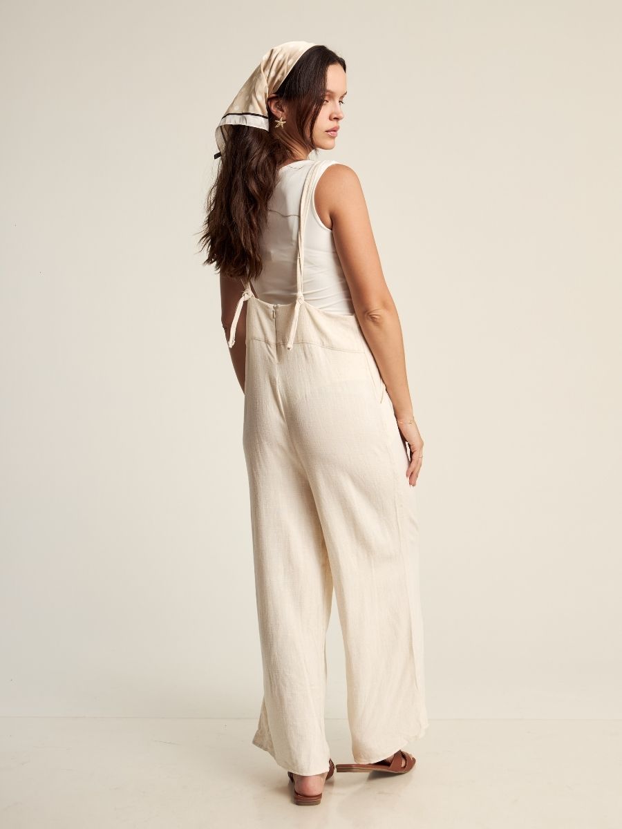 Enterizo holgado, con tirantes regulables y bolsillos laterales funcionales. Hecho en lino savanna, para mantenerte cómoda y fresca en el verano. Producción 100% peruana.