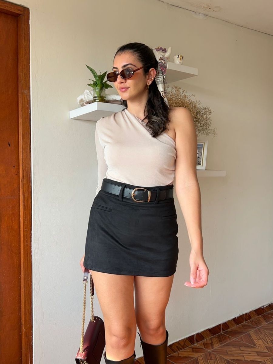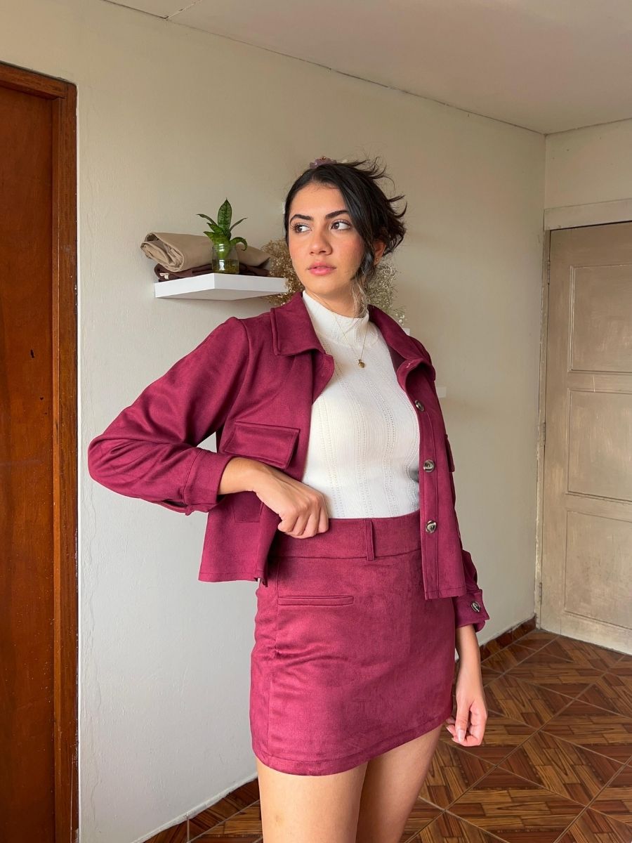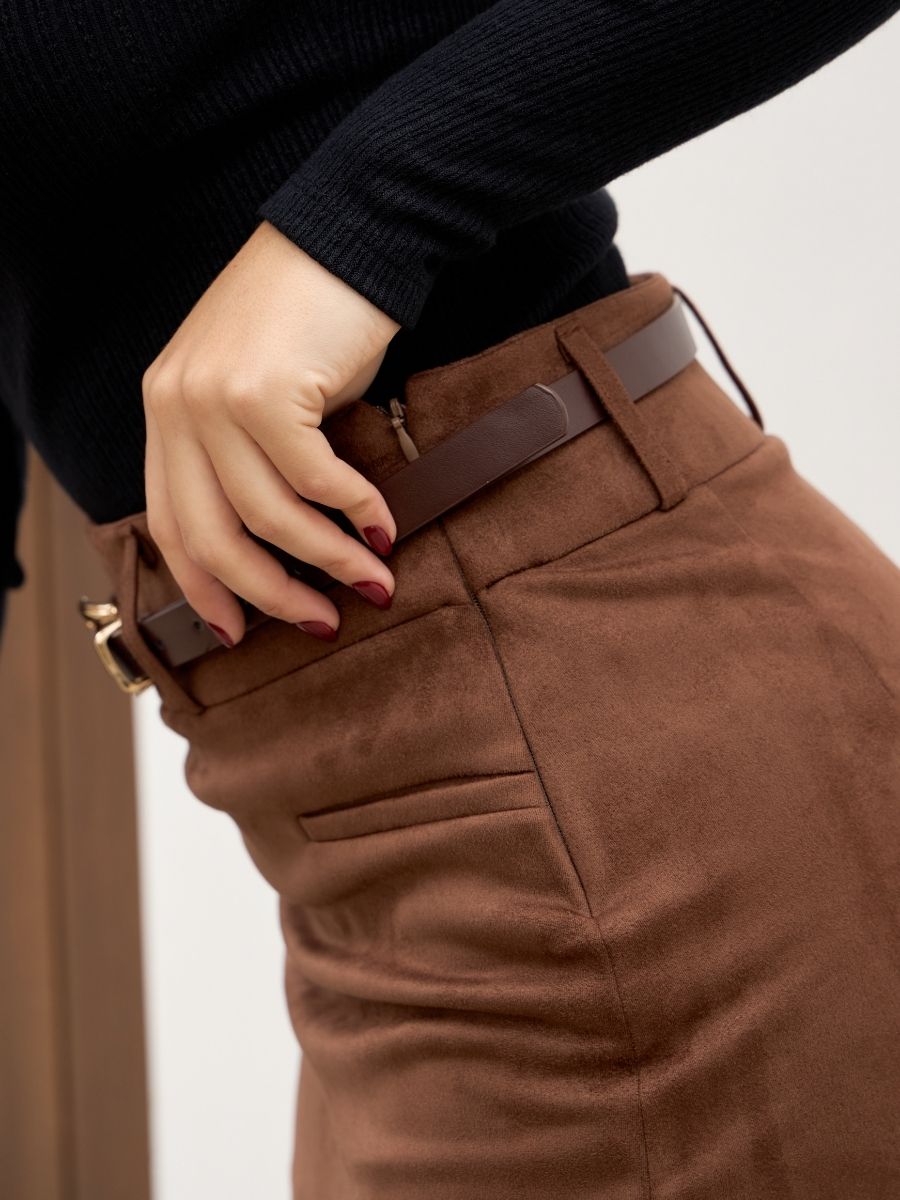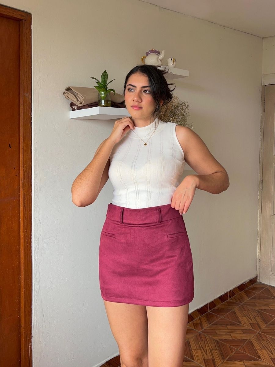 Falda recta con bolsillos decorativos, pinzas para mejor armado, short interior para mayor seguridad y comodidad. Cierre invisible lateral. Hecha en piel swede, producción 100% peruana.