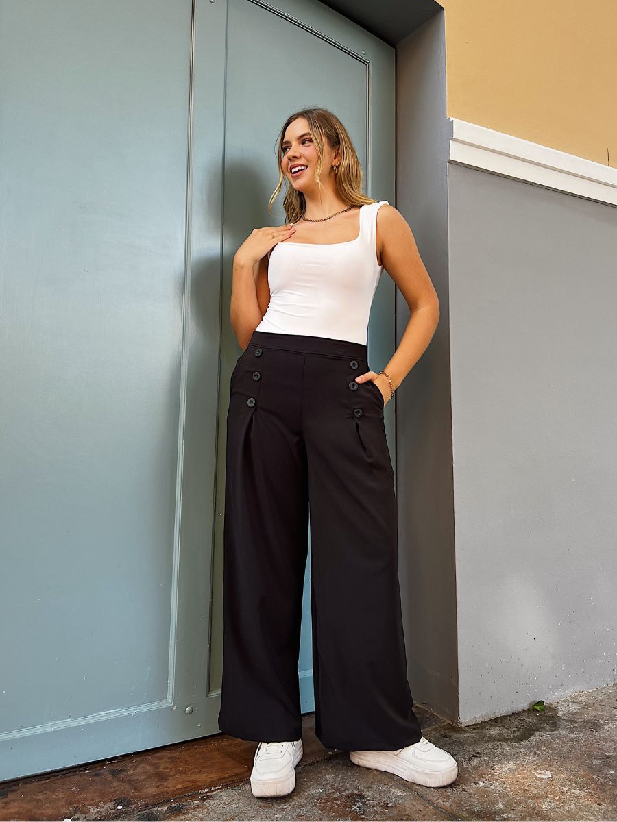 Pantalón a la cintura con detalle de pinzas delanteras y detalle de botones.