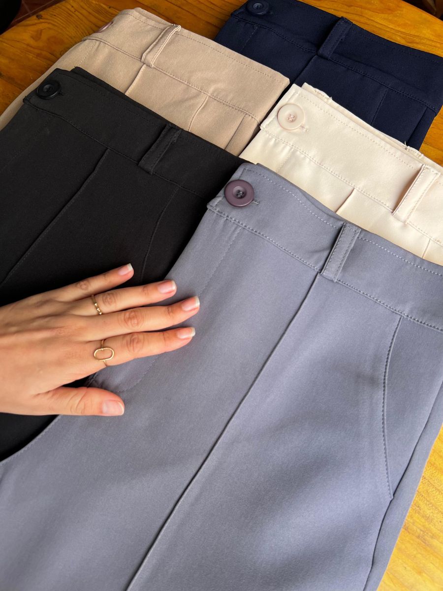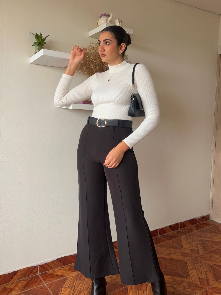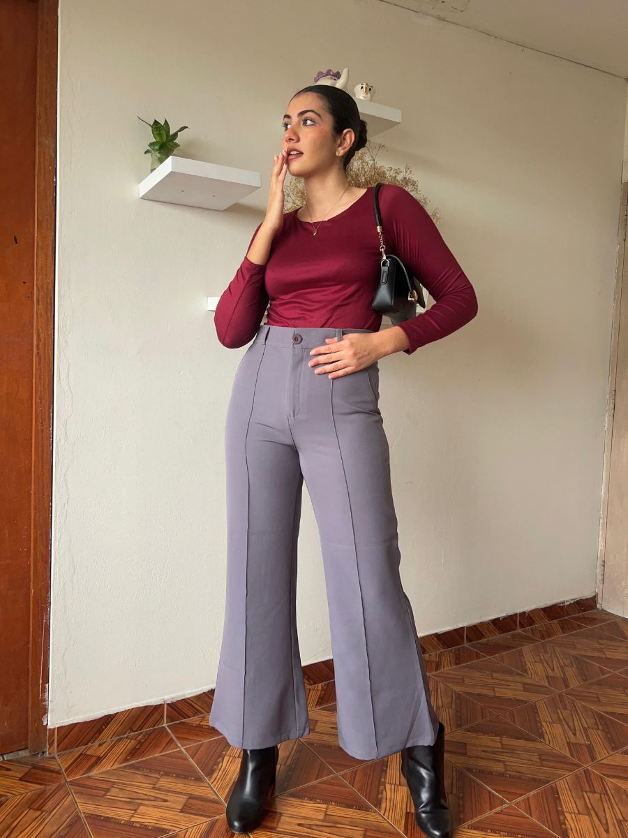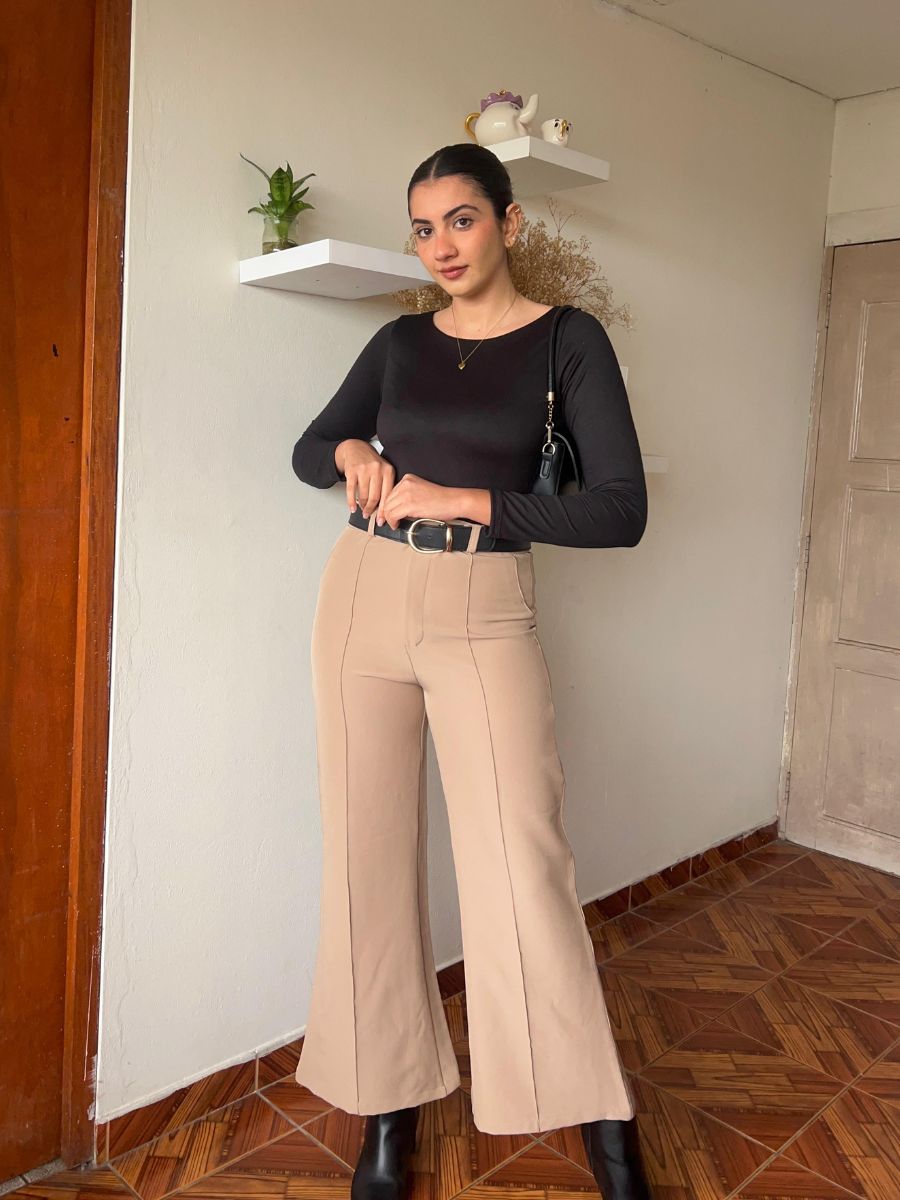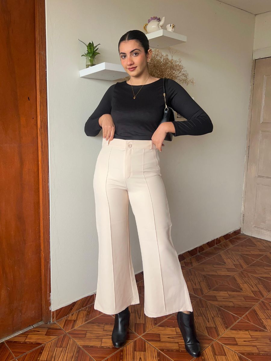 Pantalón flare largo con detalle de pinza en todo el largo de la pierna. Bolsillos traseros funcionales. Hecho en catania. Producción 100% peruana.