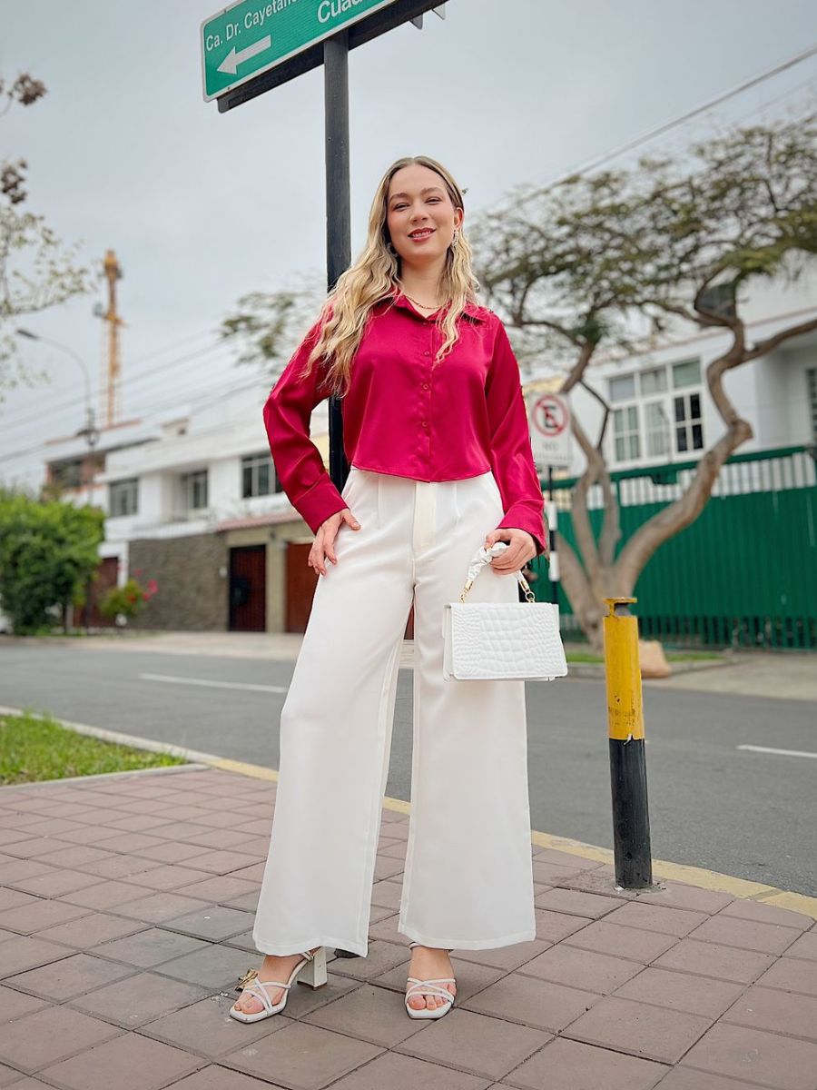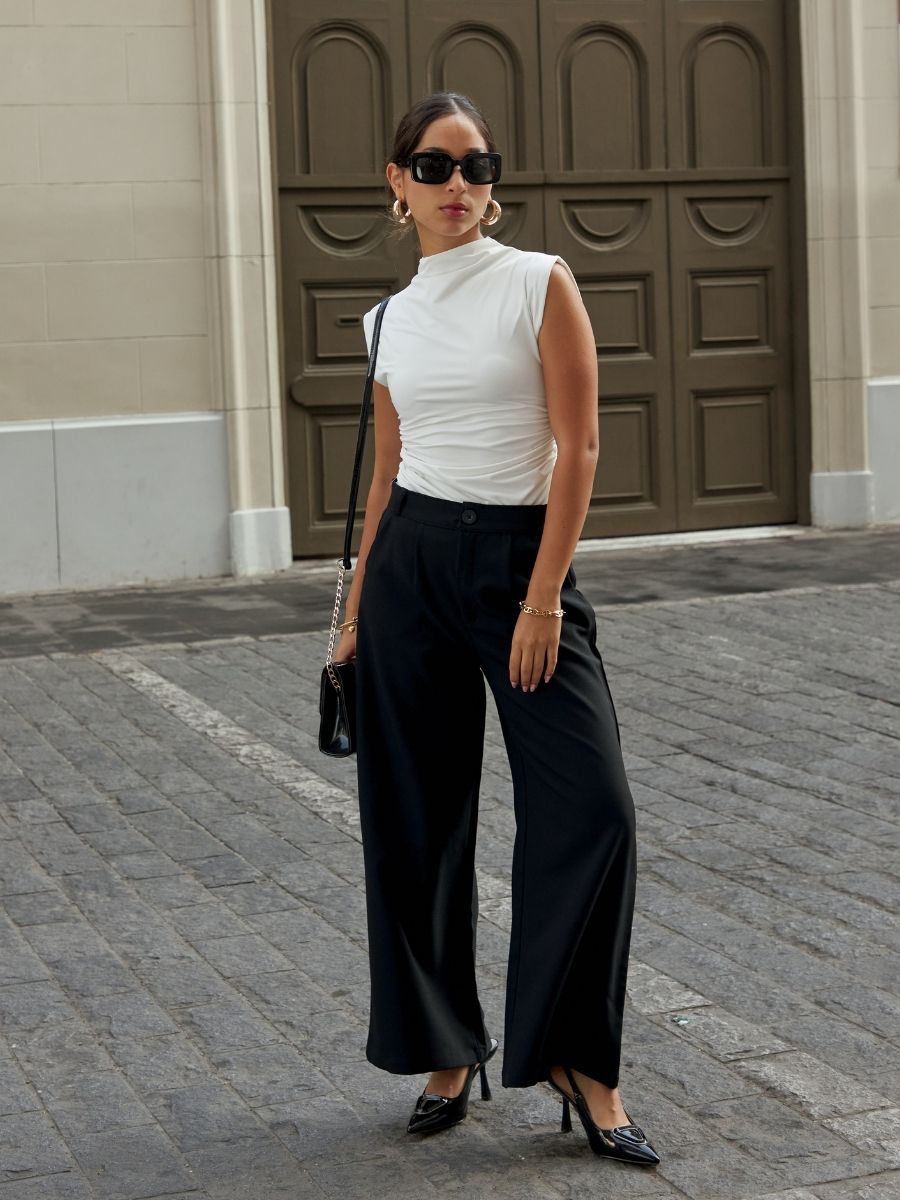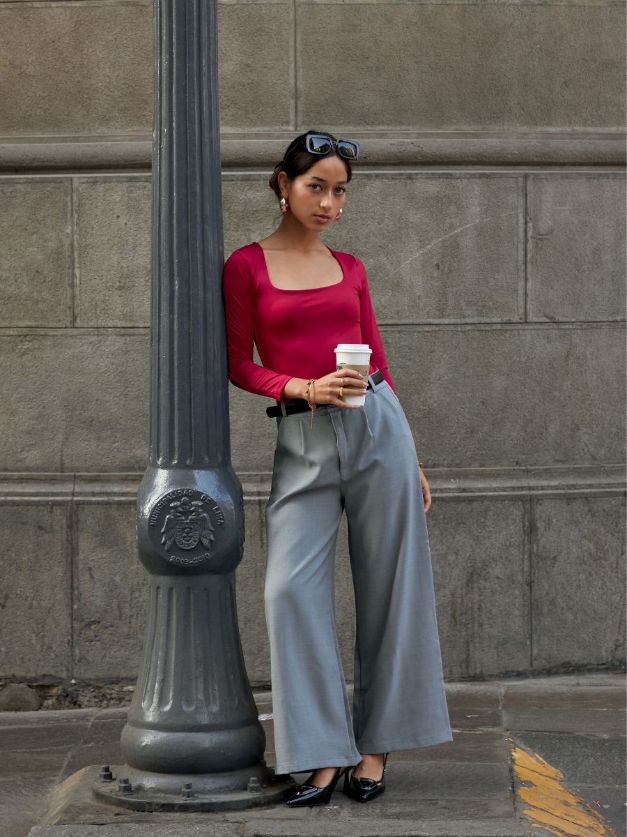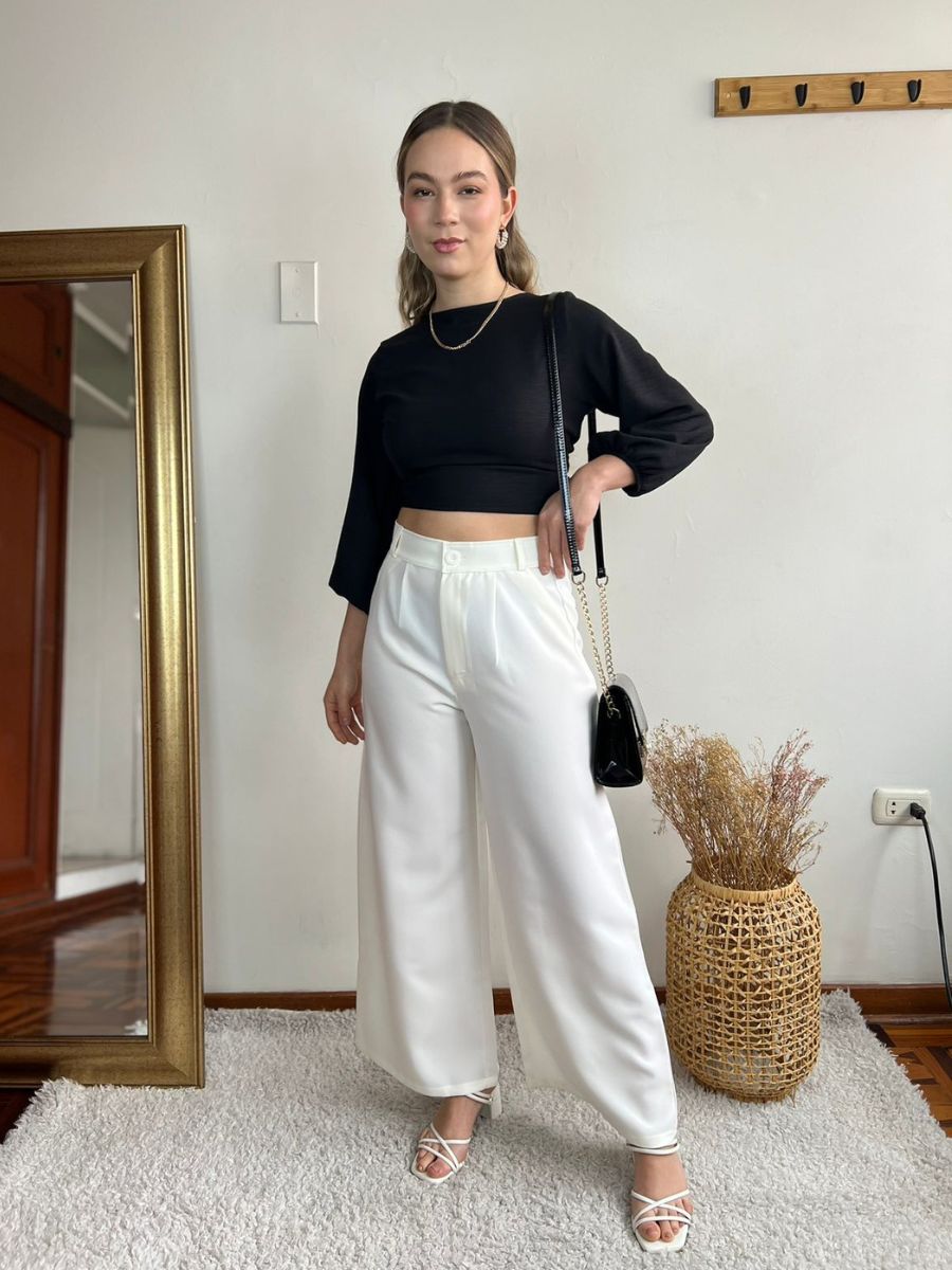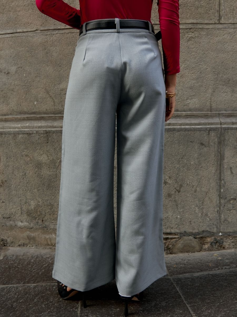 Pantalón estilo sastre, corte recto. Detalle de presillas y pinzas. Bolsillos delanteros funcionales.