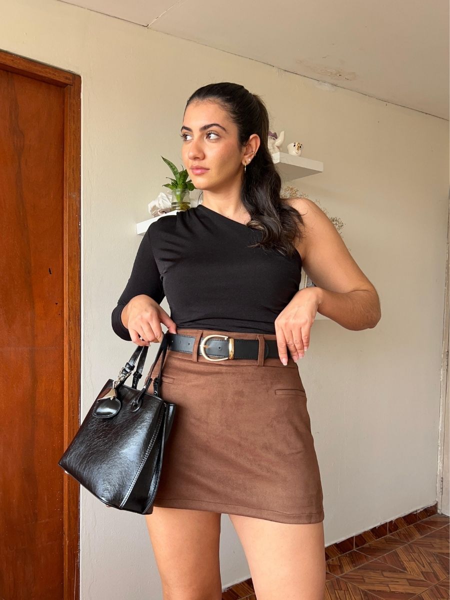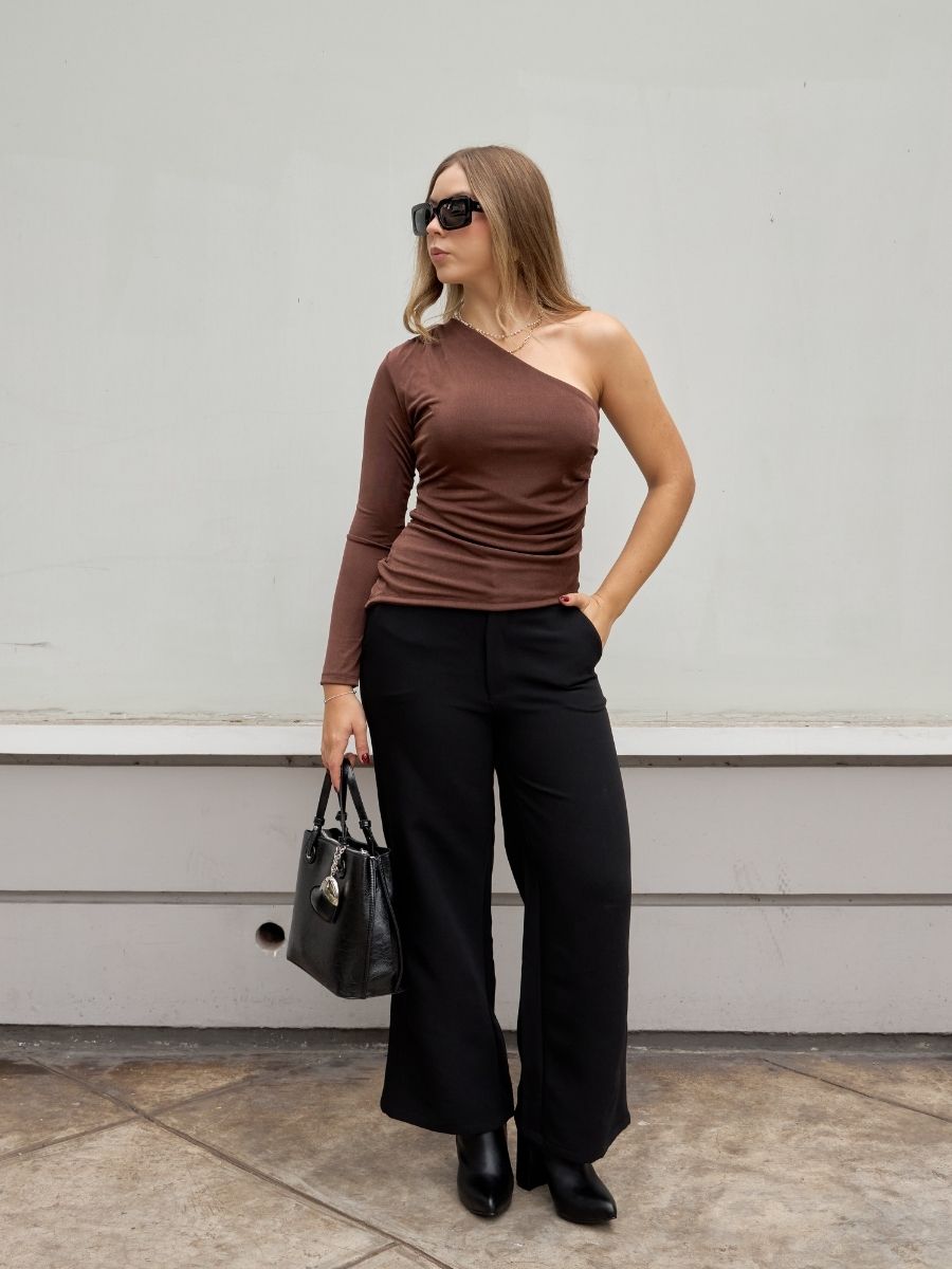 Top asimétrico de manga larga con drapeado lateral y en hombro. Hecho en acetato. Producción 100% peruana.