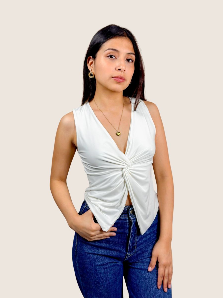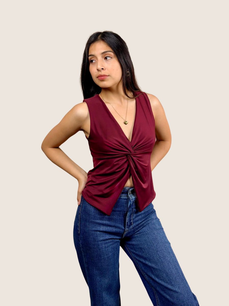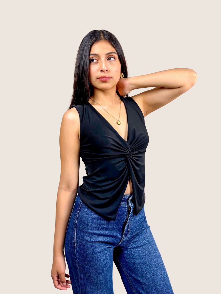 Top escote en v con detalle cruzado en busto. Hecho en tela Venecia. Producción 100% peruana.