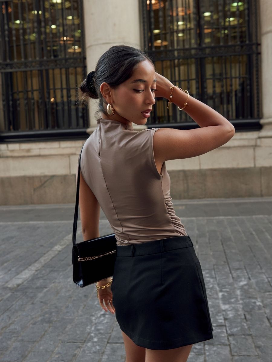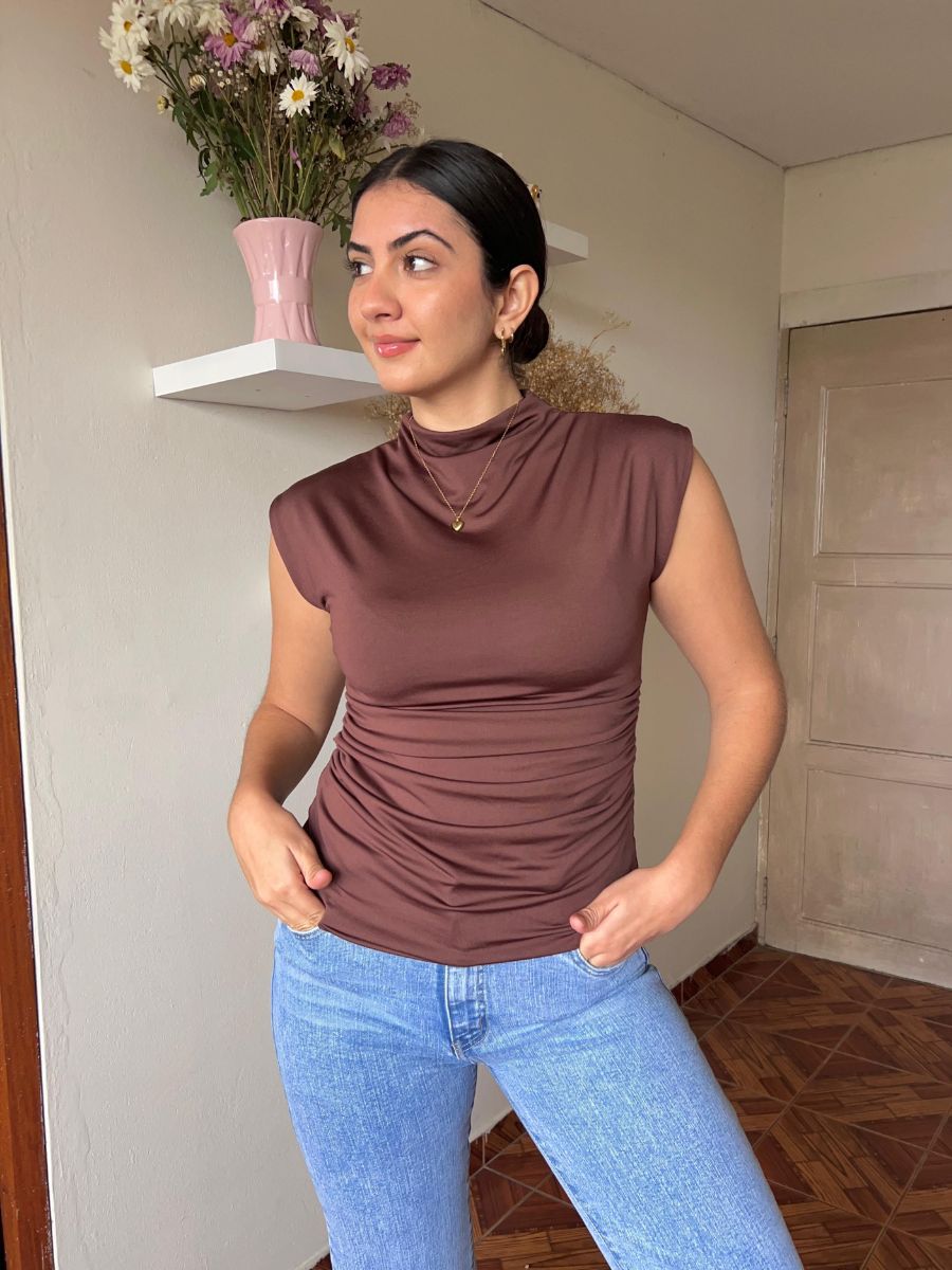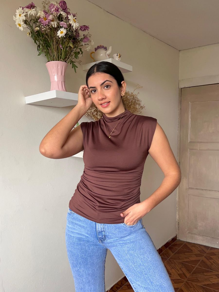 Top manga cero de cuello medio, ceñido al cuerpo con cierre invisible en la espalda y detalles drapeados a los costados. Hecho en suplex delgado embolsado. Producción 100% peruana.