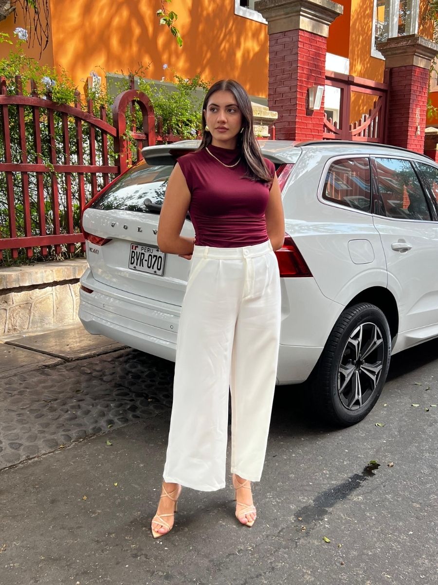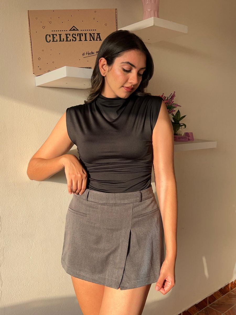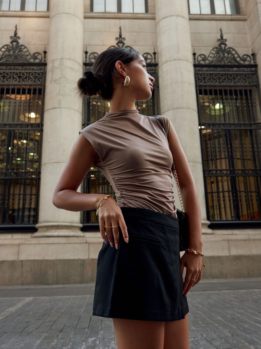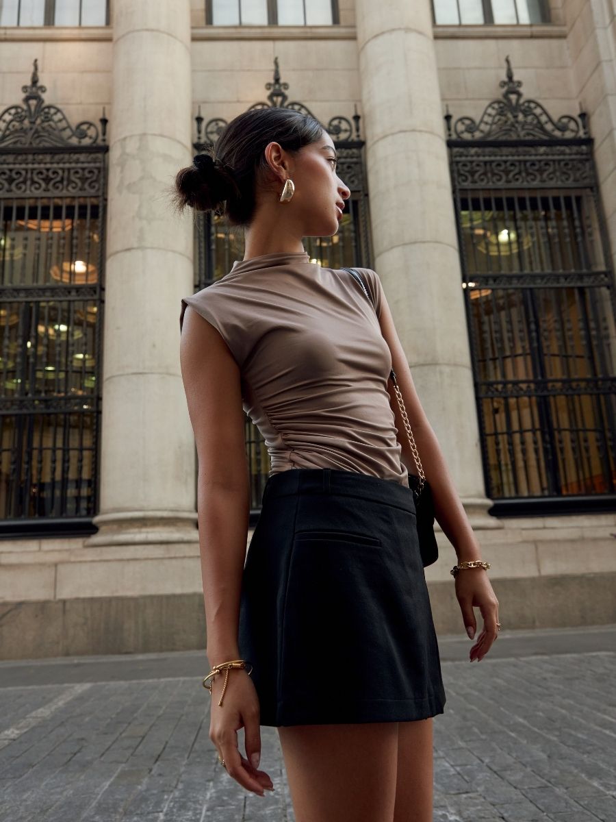 Top manga cero de cuello medio, ceñido al cuerpo con cierre invisible en la espalda y detalles drapeados a los costados. Hecho en suplex delgado embolsado. Producción 100% peruana.