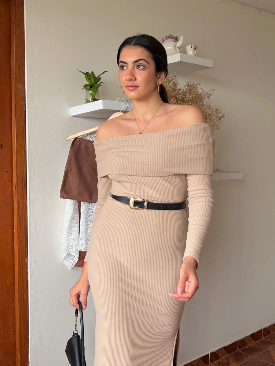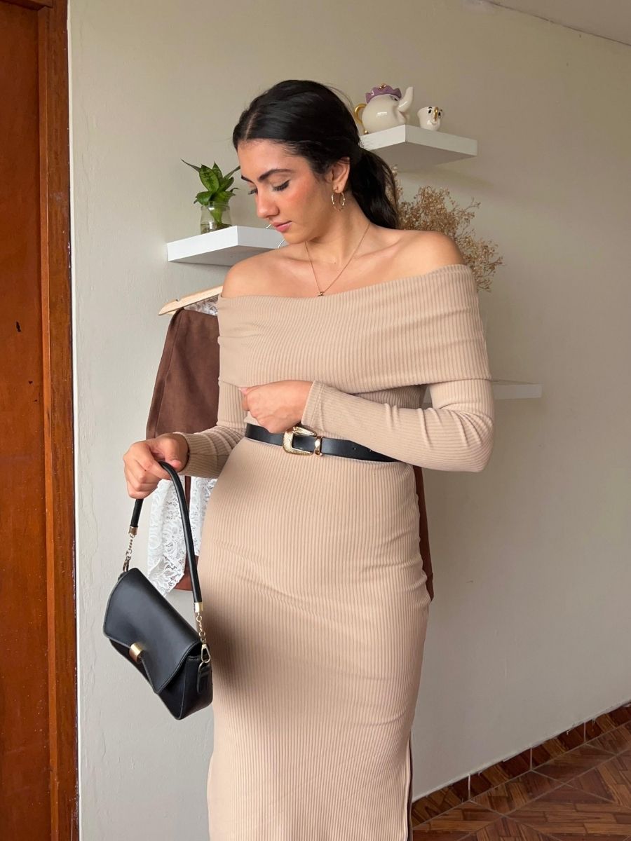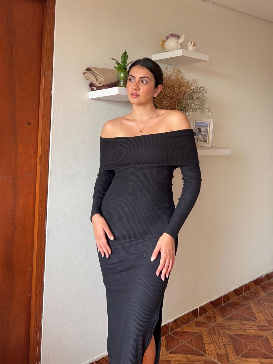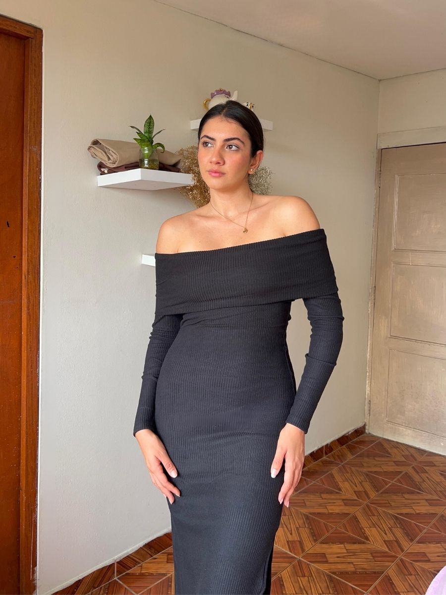Vestido cuello bardot, de manga larga ceñido al cuerpo. Abertura lateral para mejor movimiento y comodidad. Hecho en chompero Reese. Producción 100% peruana.