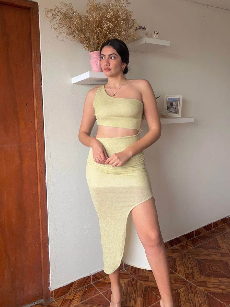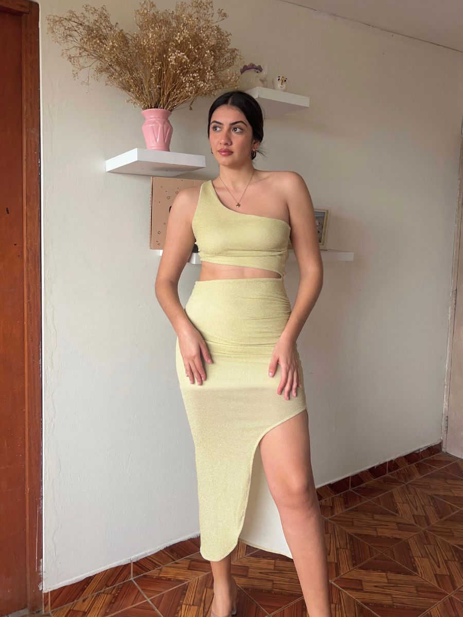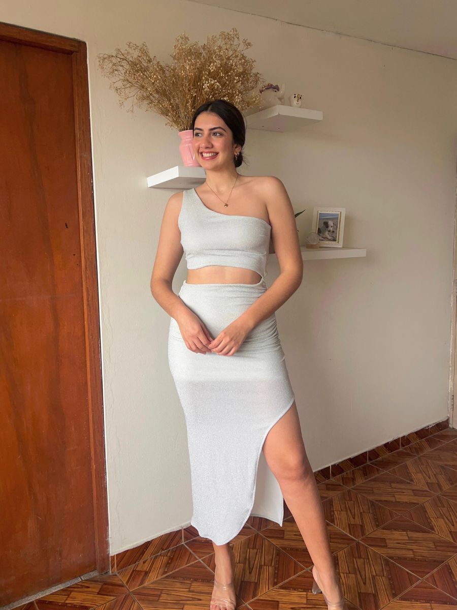 Vestido largo para mujer, top asimétrico, falda con abertura en pierna. Ceñido al cuerpo para resaltar la figura. Compleméntalo con accesorios y luce moderna y elegante. Pídelo también en color plata y color dorado.