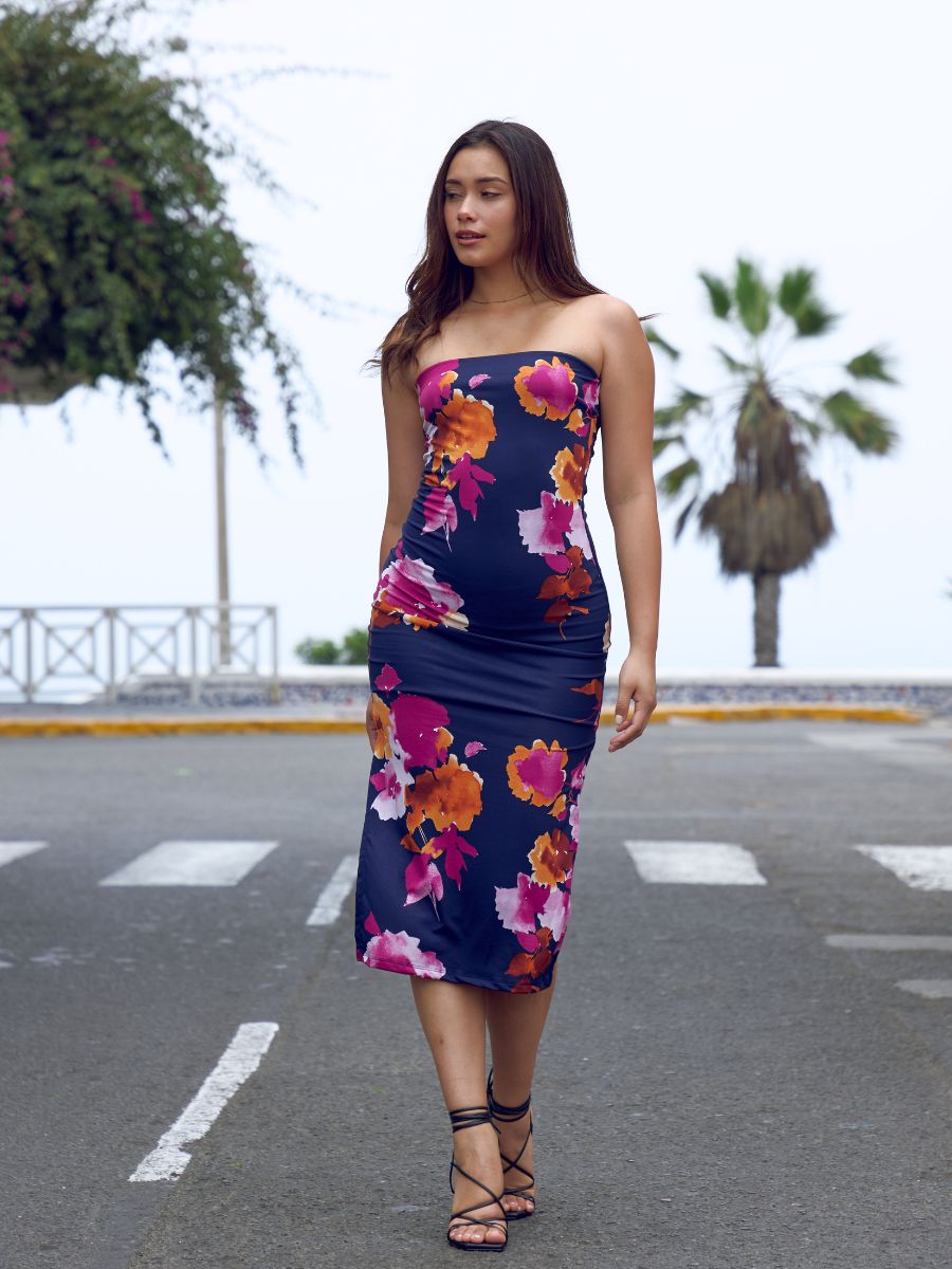 Vestido midi ceñido al cuerpo con aberturas laterales para mayor comodidad y soltura al caminar. Elasticado para amoldarse al cuerpo.